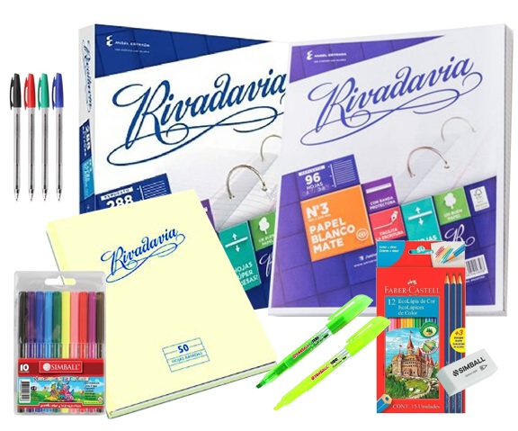 Kit escolar. Incluye: 1 repuesto Rivadavia de 288 hojas rayadas. 1 Repuesto Rivadavia de 96 hojas cuadriculado. 1 cuaderno Rivadavia tapa dura 50 hojas rayado. 1 set de marcador Simball de 10 colores. 1 Set de boligrafos Simball de 4 colores surtidos. 2 resaltadores Simball, colores varios, según disponibilidad. Lapices de colores x 12 unidades largos Faber Castell + 3 lapices negros. 1 Goma de borrar Staedler de lapiz.