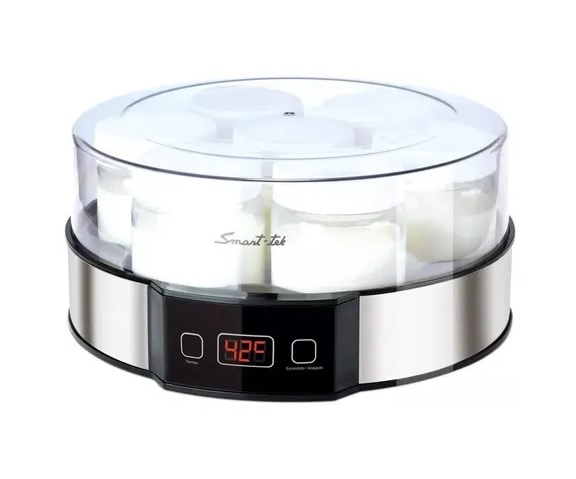 Modelo: YM750. Capacidad para 7 frascos de 180 ml. Temperatura 42º. Timer ajustable de 1 a 14 horas. Display led de timer y temperatura. Exterior de acero inoxidable. Cubierta plástica transparente. Cable de 1,2 metros de largo. Fácil de Usar.