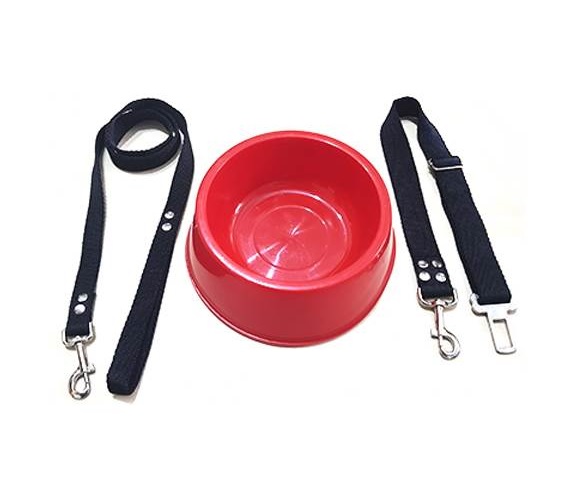 Correa de 15mm x 1,2 mts de largo. Cinturón de seguridad de 30mm x 0,7 mts. Comedero plástico pequeño (15,5 x 5cm). Correa y cinturon de seguridad de polipropileno. Foto ilustrativa, color verde de comedero y cintas.