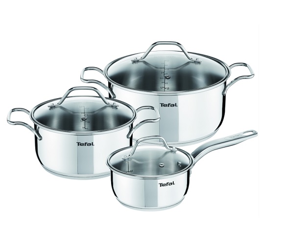 Bateria de cocina Intuition Tefal x 6 piezas. Intuition, Simple elegancia para la cocina día a día. Esta línea está fabricada en acero inoxidable y es ideal para cocinas de inducción. Acero inoxidable 18/10 de alta calidad. Bordes vertedores para facilitar el servicio. Mango de acero inoxidable para una mayor durabilidad. Graduaciones interiores para una dosificación sencilla e intuitiva. Compatible con todos los fuegos, incluyendo inducción, y horno hasta 250 °C. Producto apto para lavavajillas: Incluye: Cacerola 16 cm con mango con tapa 1,3 litros, Cacerola 20 cm con asas con tapa 2,9 litros, Cacerola 24 cm con asas con tapa 4,9 litros.