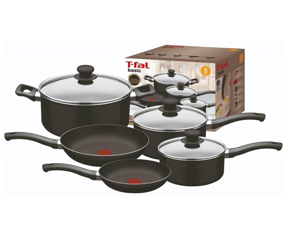 Set de Cocina T-fal Basic 8 Piezas Tapas De Vidrio. (Sartén 25 cm, Sartén 20 cm, Cacerola 20 cm + tapa vidrio, Cacerola 18 cm + tapa vidrio, Olla 24 cm + tapa vidrio). 4 capas de antiadherente. brindan 15% más resistencia a rayaduras. Recubrimiento Antiadherente. equipamiento de baquelita. Exterior de PTFE. Tapa de vidrio. Grosor 1,7 mm. Apto todo tipo de fuentes de calor, excepto induccion.
