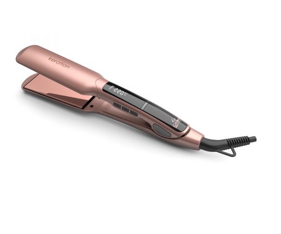 Rango de temperatura: 150º a 230º. Tamaño Wide: WL 40mm x 100mm. Tiempo de calentamiento: 50seg a 180ºC. Display Digital. Recubrimiento de placas: Tourmaline. Cable giratorio de 360º. Tecnologia Micro Glitt. Tratamiento Keration. Patin flotante. Bi-Volt. Aro para colgar.