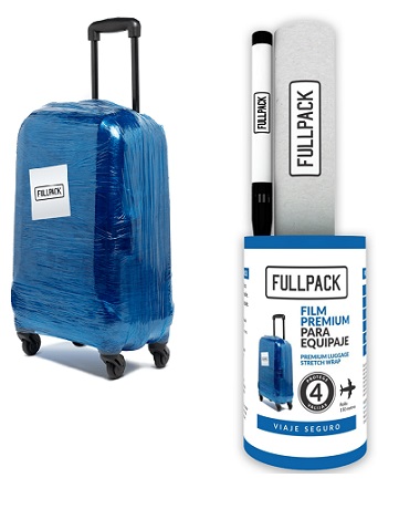 Film premium para cubrir el equipaje. 150 metros, ancho de cobertura de 12,5 cm..Se puede proteger hasta 4 valijas. 4 etiquetas rotuladoras. Muy fácil de usar y transportar, es elastico, impermeble, adherente, inalterable y aislante térmico. Color: Azul.