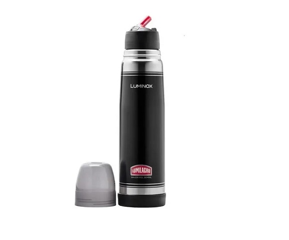 Su doble pared de acero inoxidable y el proceso de vacío exclusivo garantiza una alta performance del producto y asegura el mantenimiento de temperatura por muchas horas. Tapón para mate o café. Mantiene contenido frío o calor : 12 h. Tipo bala. Con vacío interno. Con pared doble de aislamiento. Dimensiones: Altura 33 Cm. // Diámetro 9 Cm. . Material: Acero Inoxidable /interior y exterior. Sistema de apertura de tapa con pico vertedor Lumilagro. Capacidad: 1 litro. Para líquidos fríos y calientes. Presentación en caja.Tapa plástica. IMPORTANTE: En los termos, no se recomienda colocar lácteos ni derivados, tampoco comidas para bebé / Son productos perecederos y pueden desarrollar bacterias.