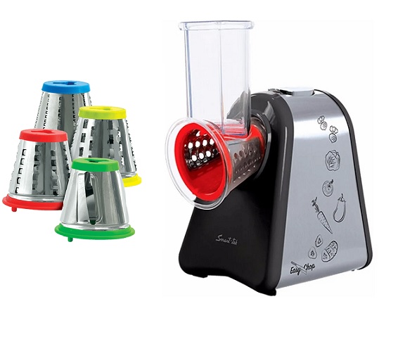 Cuerpo de acero inoxidable. Boca de entrada superior. Ralladores intercambiables. Fácil limpieza, sólo con agua. Se arma y desarma rápidamente. Base antideslizante. 200W de potencia.