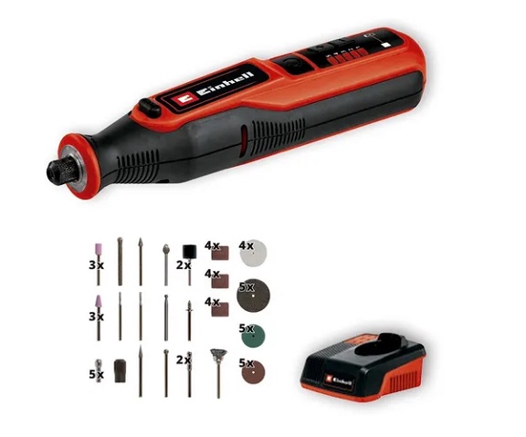 Minitorno Inalámbrico Einhell Te-mt 7,2 Li + Set 57 Piezas. La herramienta de grabado y esmerilado a batería Einhell TE-MT 7.2 Li es una herramienta universal para todo tipo de requisitos al realizar trabajos de grabado, fresado, pulido y cepillado en trabajos manuales en el hogar, el taller o el garaje. Alimentado por una batería recargable de larga duración (7,2 V | 1.500 mAh), el control de velocidad electrónico con pantalla LED garantiza que la herramienta siempre se ajuste exactamente a los requisitos de cada material, en cada situación, con velocidades de 5.500 a 26.000 rpm. Hay una perilla de bloqueo para cambiar las herramientas fácilmente. Un anillo de luz LED proporciona una iluminación óptima de la pieza de trabajo para trabajar con mayor eficacia. Además, el agarre suave ergonómico garantiza un agarre seguro y una precisión óptima. Tanto para el pulido como para el grabado, la herramienta está siempre lista para la acción gracias a la unidad de carga incluida. Acumulador 7,2 V | 1500 mAh | Li-Ion / Tiempo de carga 1h / Ralentí 5500 rpm - 26000 rpm.