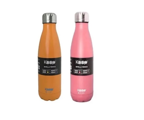 Botella térmica Keep 500 ml. Doble pared de acero inoxidable. Tapa a rosca involcable. Mantiene por 24 hs frío y 12 hs calor. Material: Acero inoxidable. Liviana y transportable. Libre de BPA. Aislamiento al vacío. Medidas: 24 x 6 cm. Capacidad : 500 ml. Color: Rosa o amarillo, según disponibilidad.